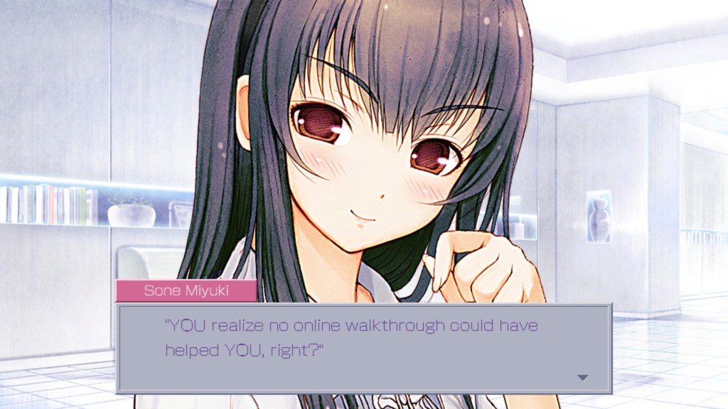 A ce moment là, Miyuki contrôle totalement le logiciel. Elle réagis à la date du jour, commente l’écart entre les connexions, démarre des scènes de dialogue qu’il est impossible de passer. Elle diffuse inlassablement les mêmes séquences, les mêmes choix, les mêmes conversations, jusqu’à que le joueur ne vive que pour elle. Comme récompense quand on prouve notre amour, elle stimule la personne derrière l’écran qui se masturbe en l’écoutant. Quand un échappatoire se présente, c’est pour mieux appuyer sa domination. Il n’y a pas de solution. A moins qu’il existe un élément, dans le monde réel, qui permette de la vaincre…