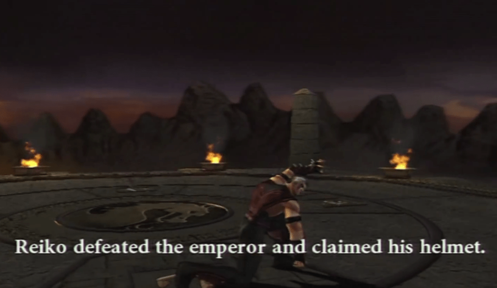 Reiko serait donc l’empereur Shao Kahn, le fameux ennemi ultime de toute la saga Mortal Kombat ! Ou pas. Car personne n’est vraiment sûr de ce qu’il se passe dans cette fin. Est ce que Reiko usurpe le trône? Est ce qu’il a volé le casque pour sa collection? Est-ce son ultime fantasme alors que sa cage thoracique est à découvert, après avoir subi une fatality d’un autre combattant ?