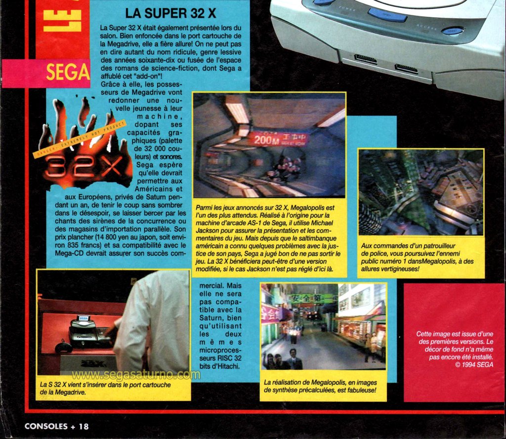 Jackson devait également être un des personnages principaux de Megalopolis : Tokyo City Battle sur le même support, apparition aussi annulée à cause des accusations. C’était, contrairement à Scramble Training, une séquence animée sans aucune interaction où le « joueur » se met à la place d’un policier du futur et suit une courte course poursuite effrénée via la borne (sans doute avec tout ce qu’il faut de mouvements et vibrations). Ce projet est la première création de Tetsuya Mizuguchi, plus tard connu pour Space Channel (dont on reparlera dans la partie 2), Rez ou Tetris Infinite.