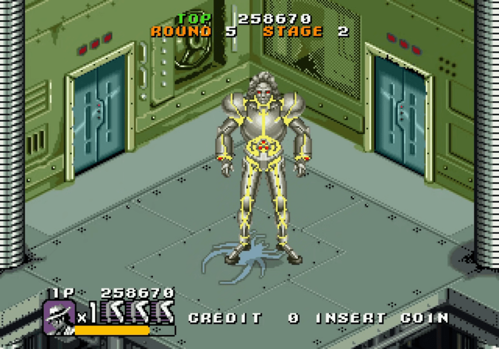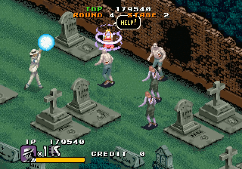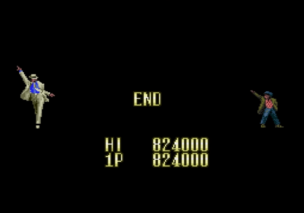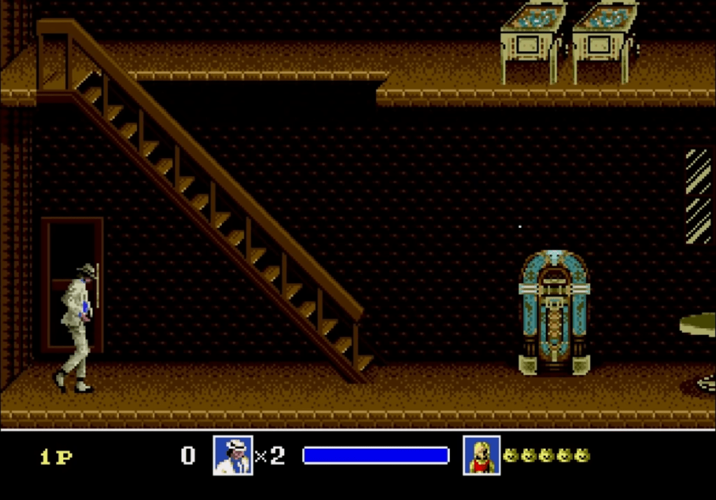 Il n’y a pas grand chose à dire sur la version arcade, c’est un jeu classique de l’époque destiné à manger les pièces des infortunés assez téméraire pour essayer d’en voir la fin. Il est très beau, se joue bien, et la bande son est composée de remix 16 bits des plus grands tubes du roi de la pop. La particularité est qu’il peut se jouer a 3, ce qui permet d’avoir trois Michael de couleurs différentes dont un rouge qui prédit Blood on the Dance Floor et le costume noir de You Rock My World de dix ans. En utilisant un power-up, il peut se transformer en robot qui tire des rayons lasers avec les yeux, comme dans le film. Cette version est un peu oubliée maintenant, la faute a un loop de gameplay très répétitif et des décors tout du long assez similaires. A noter d’ailleurs que les deux jeux mettent en scène le costume de la séquence « Smooth Criminal », les créateurs ayant bien compris quelle partie est la plus intéressante.