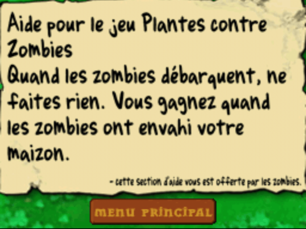 Les zombies communiquent par notes pour menacer le propriétaire. Parmi celles ci, une particulière est présente dans le menu « aide » sur l’écran principal. La lettre indique que pour gagner au « jeu de plantes et zombies », il faut laisser les zombies rentrer dans la maison. Plein d’autres notes sont présentes mais ne sont pas aussi rentre dedans dans le « méta ». Celle ci n’est présente que dans les version PC et DS.