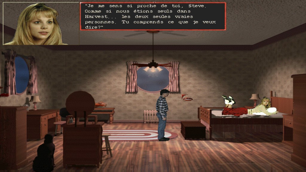 Steve, coquille vide sans grand charisme ayant perdu la mémoire, se réveille dans une petite bourgade américaine des années 50, Harvest, dont la la vie est articulée autour de coutumes étranges et de personnages atypiques. L’inspiration est évidente, on est ici dans une version trash de Twin Peaks, a la sauce FMV. J’épargne ici les moments les plus violents mais sachez que le jeu ne tarit pas en scènes gores.