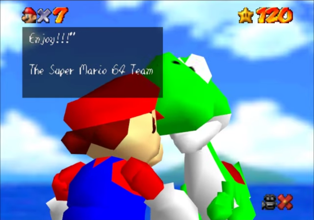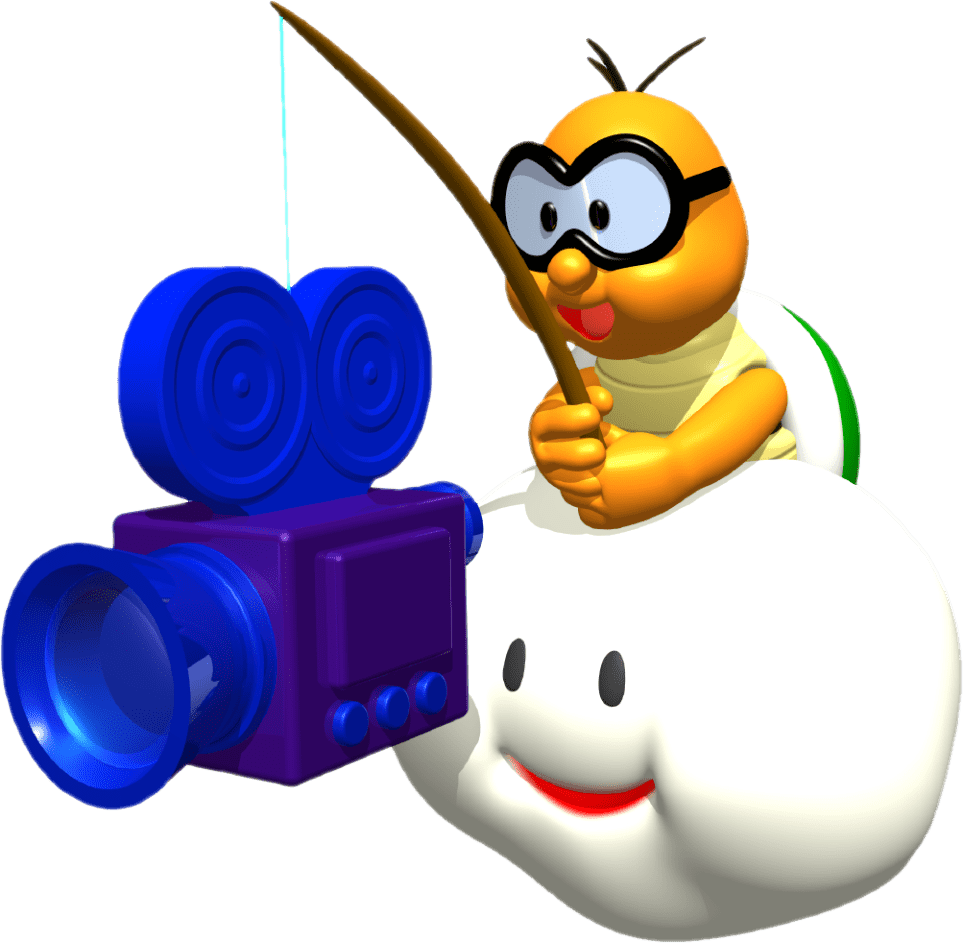 Pour expliciter la vue 3D un personnage fait le pont entre celle ci et le joueur. Comme le montre l’intro du jeu, un Lakitu filme Mario qui rentre dans le château, pour symboliser la vue « de dos ». Ce qui est un peu moins connu, c’est qu’il suit Mario en permanence, comme il est possible de le voir quand on se met face a un miroir. Le point de vue n’est donc pas a la troisième personne, mais a la seconde, car on suit la vue de quelqu’un qui regarde ce que filme Lakitu. Dans le lore, il s’agit d’employés du Kingdom News Network venus faire un reportage.