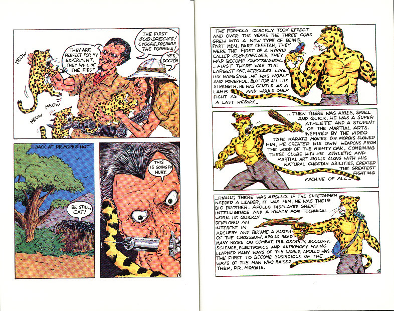 Évidemment crées pour surfer sur la popularité des Tortues Ninjas, les Cheetahmen, trois guépards mutants altérés par un scientifique fou, sont envisagés au centre d’une franchise comportant des comics, des figurines, une série TV, des jeux vidéos, une mascotte grandeur nature… Chacun des membres du groupe est bien distinct, reprenant peu ou prou les archétypes des tortues : l’un est fort et stoïque, l’autre rapide et blagueur, et le le dernier est le leader a la tête froide, leur nom étant inspiré de la mythologie grecque au lieu d’être une référence aux artistes de la renaissance. Le scientifique quant à lui ressemble assez au fameux Dr Morbius de Marvel, reprenant son nom de manière peu déguisée ainsi que vaguement son apparence. On peut souligner aussi le plagiat de « It Takes Two » de Rob Base & DJ E-Z Rock pour la musique d’intro.