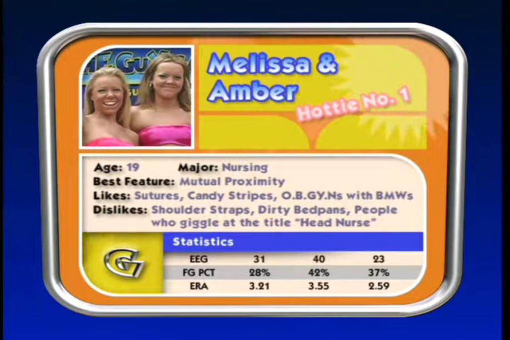 The Guy Game est un jeu de quizz multijoueur où un présentateur va poser des questions a des femmes en maillot sur la plage. Si elles répondent mal, elles doivent enlever le haut. Voilà, c’est basiquement tout ce qu’il y a a savoir du magnum opus de Jeff.
