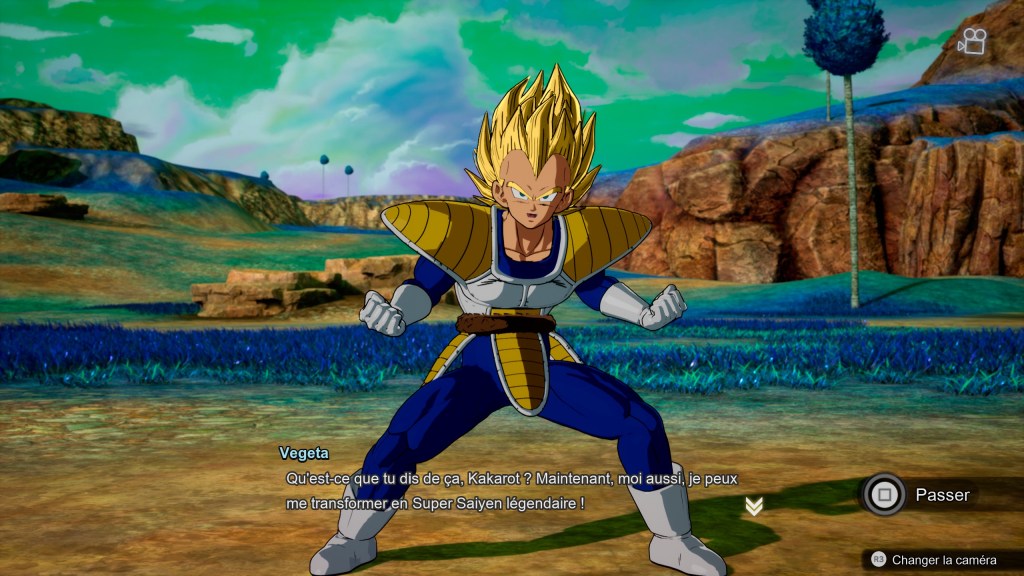 Les crédits de fin défilent. On voit passer toute la Z Team, mais Vegeta n’est même pas mentionné. Une fois le mot « FIN » disparu, la musique change et devient inquiétante. Vegeta apparait et stoppe nos héros dans leur lancée.