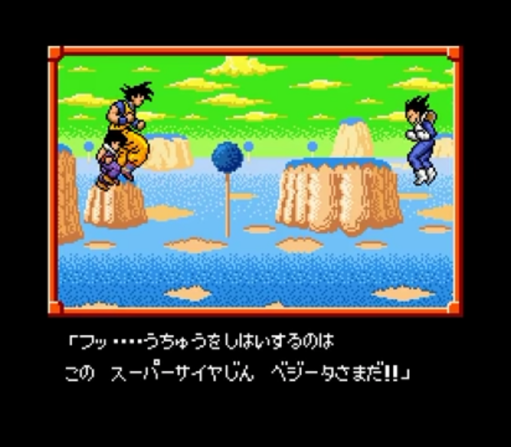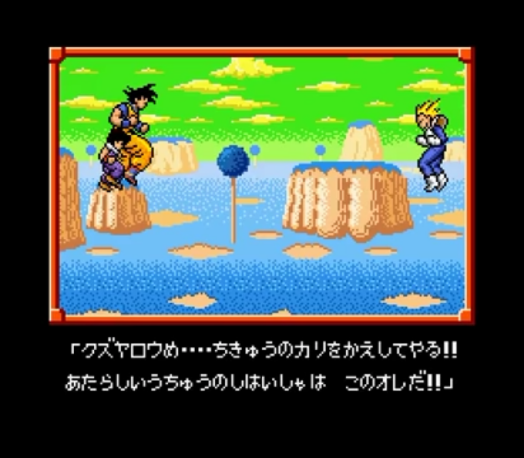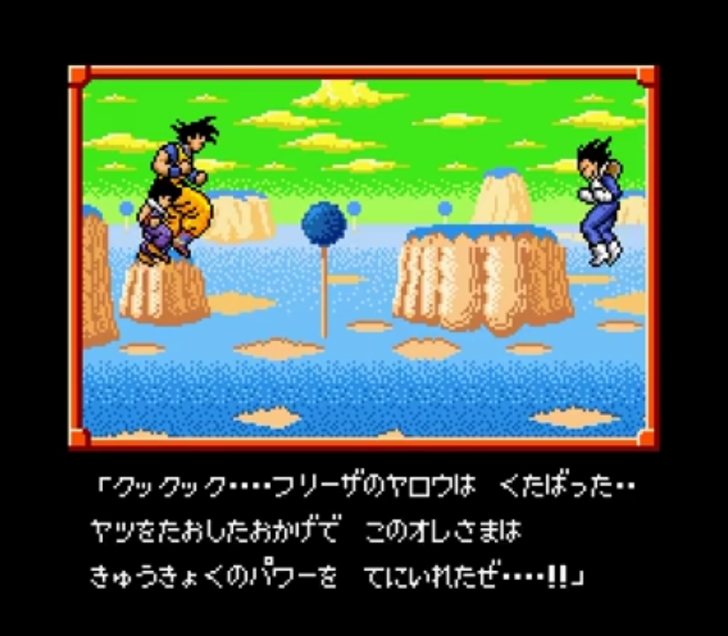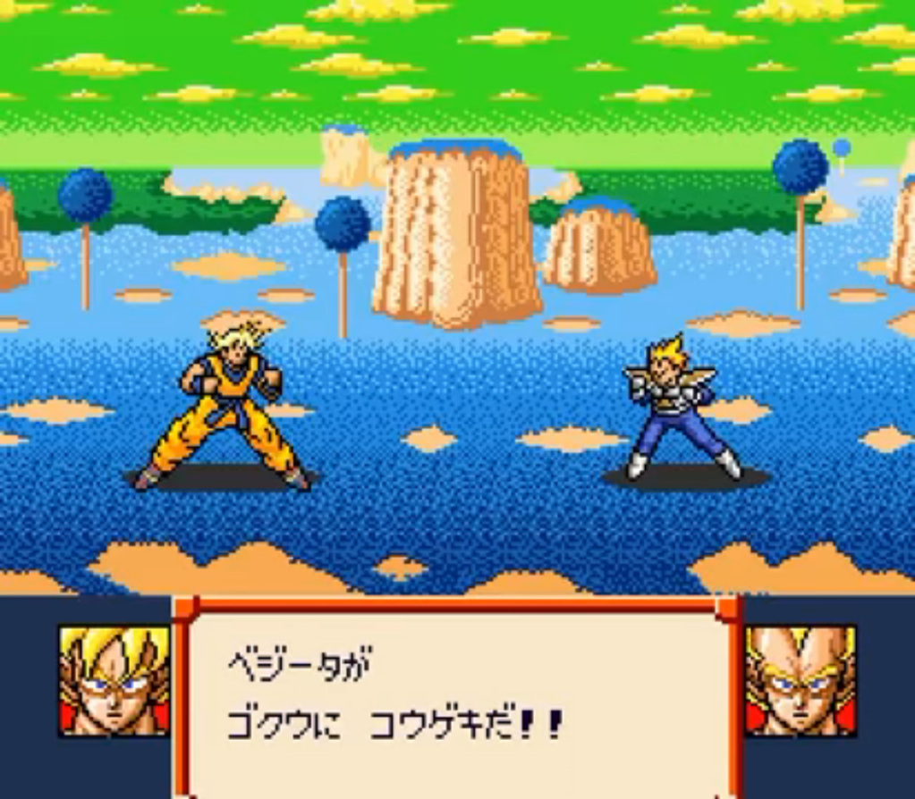 Outre le fameux jeu popularisé par le Joueur du Grenier en France, la saga Dragon Ball sur NES était représentée dans son pays d’origine par une série de RPG au tour par tour proposant d’utiliser les diverses capacités de la série sous forme d’un deck de cartes piochées aléatoirement. Remake des deux premiers épisodes NES basés sur DBZ, Super Saiyan Densetsu reprends la formule de ses ainés avec des graphismes améliorés et rajoute le combat final de Goku en super saiyan contre Freezer qui avait du être coupé de l’épisode précédent, Dragon Ball Z II: Gekishin Freeza!!.
