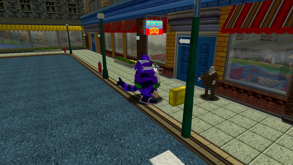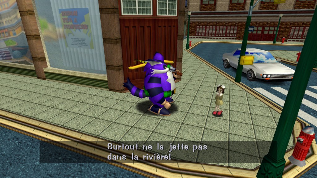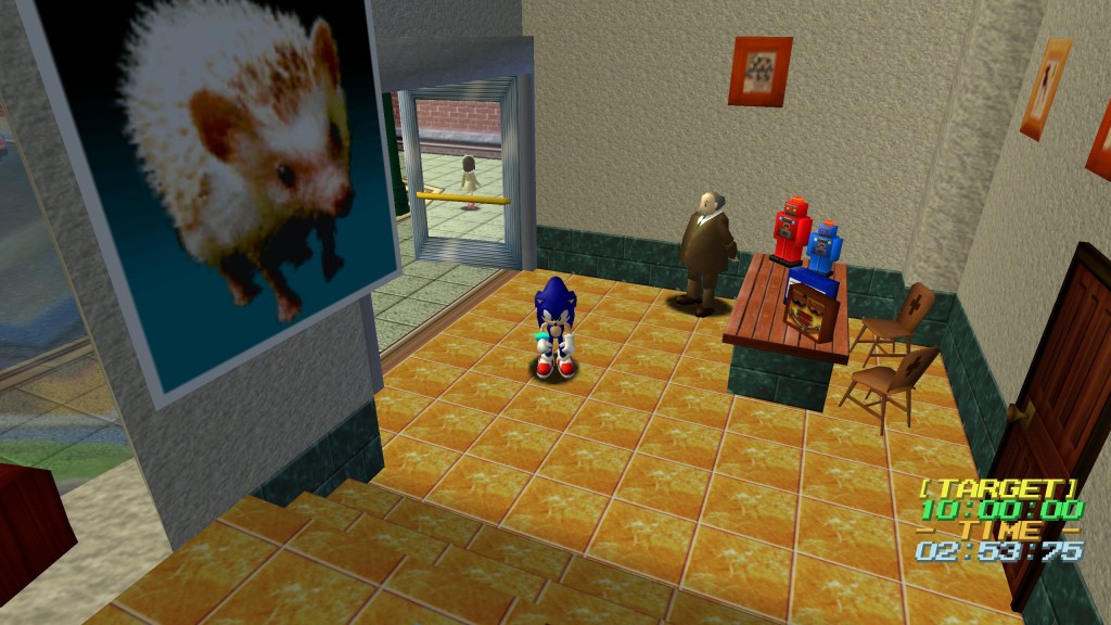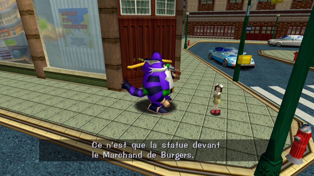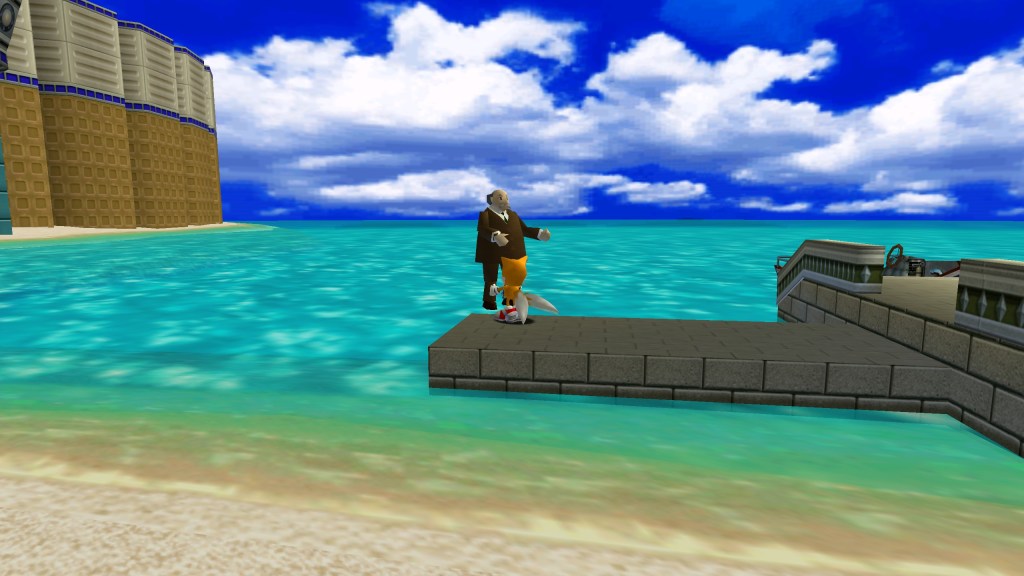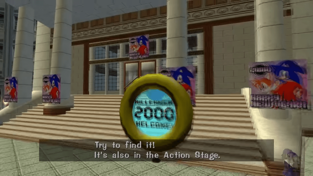 Nouveauté pour la série, Sonic Adventure propose un semi monde ouvert avec des NPC proposant des interactions propre a chacun d’eux. Plusieurs personnages sont représentés par le même modèle, dont un antiquaire, un gardien d’un immeuble et surtout une statue immobile qu’il est possible de soulever et lancer a peu près où l’on veut. Ce modèle est un hommage au colonel Sanders, le fameux créateur de la firme KFC, histoire qu’on peut découvrir via plusieurs personnages parlant de lui comme l’homme ayant découvert la recette secrète des épices, ou comme un patron d’un fast food. Il faut savoir que, même si ce n’est a ma connaissance pas le cas en France, KFC est connu aussi par ses statues représentant le Colonel placées en face des restaurants de la firme.