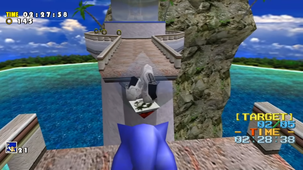 En incarnant Big the Cat, l’un de ces personnages nous ordonne de ne surtout pas jeter la statue à l’eau.