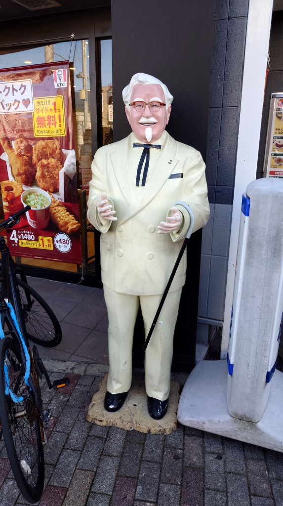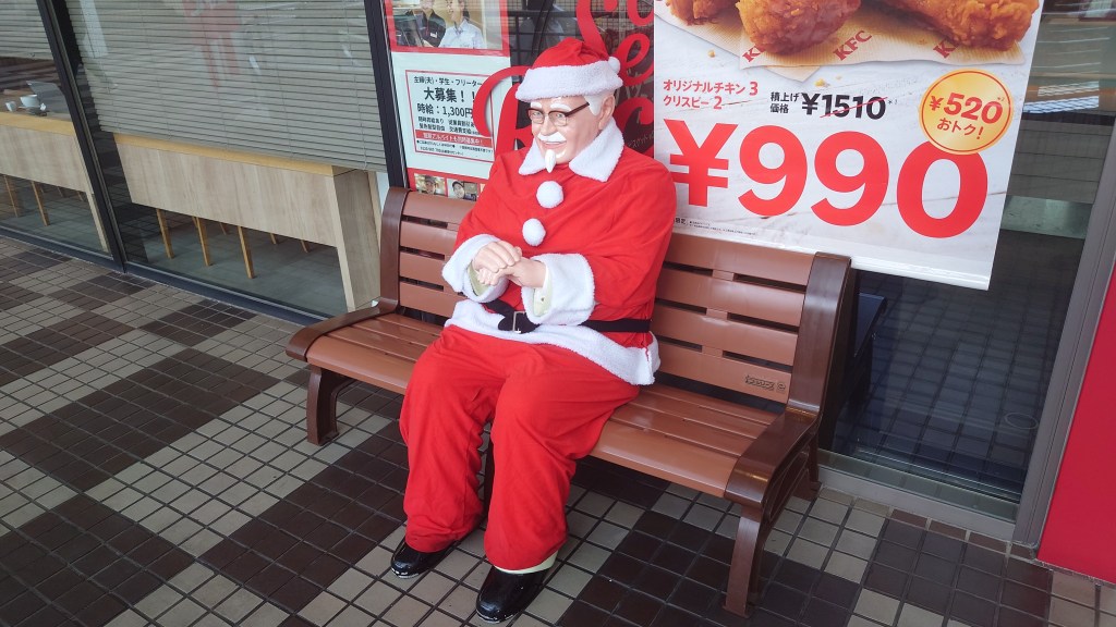 Il faut savoir qu’au Japon, KFC est un emblème absolu de noël. Surfant sur l’occupation américaine suite à la seconde guerre mondiale, KFC s’est implanté dans les contrées nippones en même temps que l’idée de fêter Noël le 25 décembre devint populaire là bas et, jouant volontairement sur une fausse relation entre les deux événements via une campagne de pub dans les années 70, KFC et noël ont été inconsciemment mélangés dans l’imaginaire japonais. Il est depuis normal là bas de manger un bucket de poulet a noël, les restaurants de la firme vendant leurs différents produits sur réservation a cette date. Ce n’est donc pas anodin si tant de statues du Colonel sont présentes dans le pays. Pour plus d’infos sur le sujet.