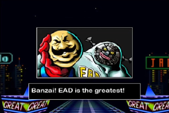 Si vous n’avez pas encore compris qui est ce personnage, c’est simple : il s’agit d’un robot basé sur le fameux plombier italien. EAD est le nom du département de développement créateur de la saga F-Zero parmi tant d’autres (Nintendo Entertainment Analysis and Development), et Shiggs Mapone est une référence a Shigeru Miyamoto, le créateur de Mario. Kyoto est évidemment le lieu de naissance de Nintendo.