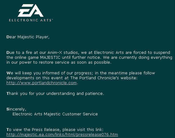 Majestic est un jeu PC publié par Electronic Arts dont la prétention était de proposer une expérience interactive inédite, tirant parti de la démocratisation d’internet dans les foyers au détour des années 2000. Prenant la forme d’une interface web où il est possible d’interagir avec divers types de contenus, le jeu consiste en une conspiration prenant cible un studio de jeu vidéo disparu qui, dans une mise en abîme innovante, est celui ayant développé Majestic lui même : le joueur ne joue pas à Majestic, mais mène l’enquête pour déchiffrer sa disparition. Il faudra donc, via des appels en temps réel, des e-mail, des messages sur chat AOL ou des vidéos, déchiffrer le mystère autour de la disparition du développeur après la supposée fermeture du jeu.