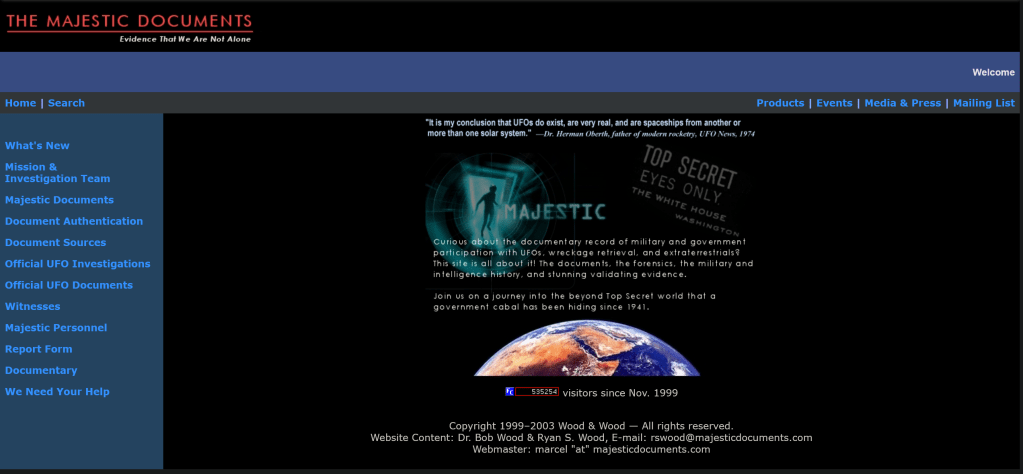 J’ai découvert cette page dans les fichiers du CD du jeu trouvé sur archive.org. Candide, j’ai tenté de taper le nom du site dans la Wayback Machine, ce qui m’a effectivement donné un site crée en 1999. Sauf que, en continuant, on voit que le site a été mis à jour en 2001 (normal), 2002 (probable), 2003 (improbable) et ce jusqu’à nos jours ! Oui, en 2024 ce site existe encore et est toujours actif ! Et vous vous dites peut-être que c’est une coïncidence ou une URL rachetée? Peu probable, car de novembre 2003 à juillet 2020, le site comporte le logo du jeu en page d’accueil. C’est, de ce que je peux en déduire, un authentique site sur l’étude de complots extraterrestres. On peut affirmer sans problème que le The Majestic Documents date d’avant la création de Majestic et lui a survécu de très loin. Est ce qu’il s’agit du site personnel du créateur qui s’est servi du jeu pour se faire de la pub? Mystère total.
