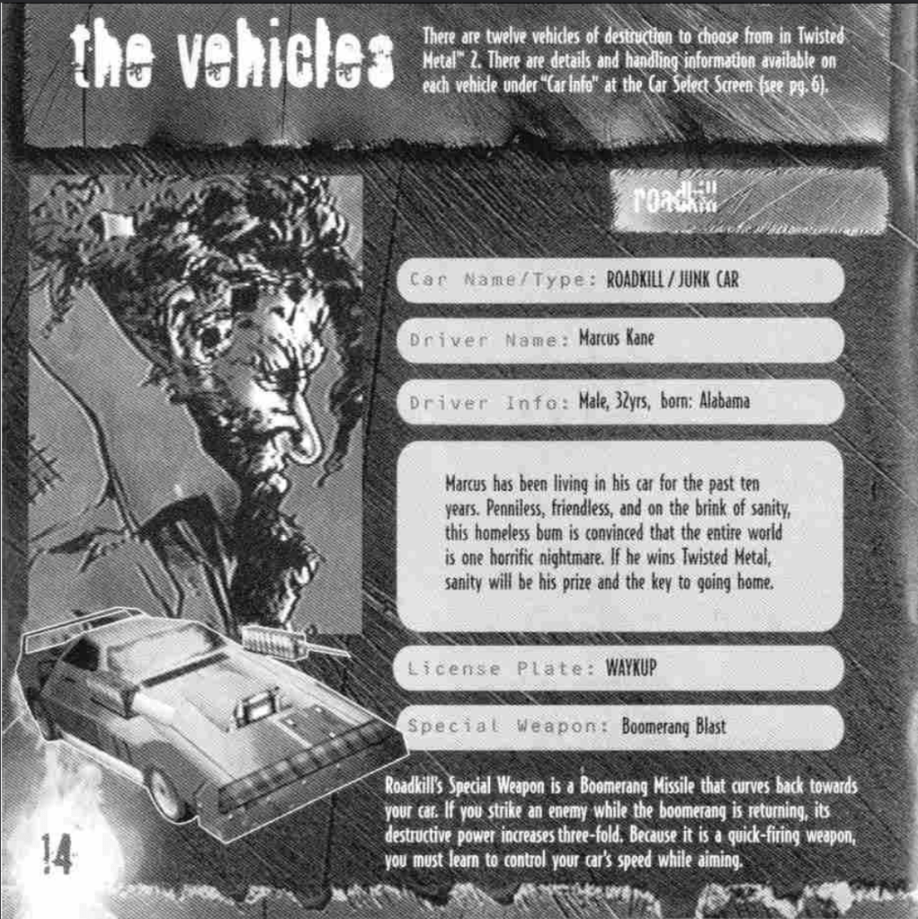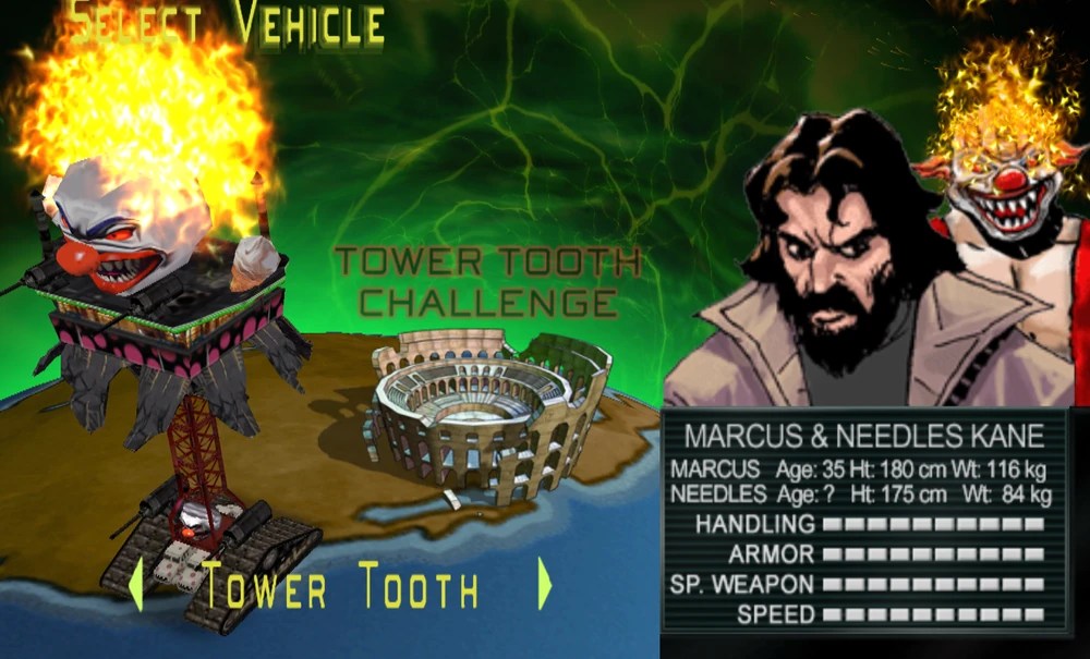 Le but de cet article sera de décoder la trame principale de Twisted Metal. Étant un jeu de voiture, le sel de la série est avant tout la variété et le nombre de véhicules jouables, chacun ayant son pilote avec ses motivations propres. De ce fait, beaucoup d’éléments se contredisent volontairement (les conclusions du mode histoire de chacun montrent parfois des réalités complétement différentes). L’histoire de Marcus et Needles Kane, bien que centrale a l’intrigue, peut être totalement occultée si on ne prends pas la peine de la suivre en sélectionnant dans chaque épisode les personnages correspondants. Il faut donc garder en tête que ce que je décris ici ne représente qu’une petite partie de la richesse de la saga (il y a une soixantaine de personnages jouables répartis sur 8 jeux), et j’invite chacun a se pencher plus en détail sur celle ci.