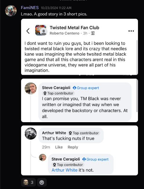 David Jaffe (comme dit plus haut, le co-créateur de Twisted Metal ainsi que des deux premiers God of War) a déclaré en 2020 dans une interview/rétrospective que les jeux ne sont pas liés au niveau de l’intrigue, reprenant un contexte global commun sans jamais se faire suite, et que tout le personnage de Minion dans Black n’était qu’un easter egg conçu a la va vite a la fin du développement. J’ai quand même du mal à y croire, du fait que tout se goupille trop bien dans un développement cohérent et que les éléments se répondent entre eux (comment justifier alors que Charlie Kane dans Black soit contrôlé par un troisième fils dont on ne reparle plus jamais?). De plus, certaines storyline de personnages dont je n’ai pas parlé forment une trame continue (comme les deux policiers Jamie et Carl Roberts dont les histoires se suivent directement entre Twisted Metal 1, 2 et Head-On, ou bien Mr Grimm qui est la mort personnifiée dans Twisted Metal 1, 2 et Head-On mais PAS dans Black, épisode qui est, vraisemblablement, une illusion où tous les personnages sont altérés par l’esprit malade de Needles). Peut-être que ces éléments viennent d’un autre scénariste non crédité, du co-créateur Scott Campbell ou d’une séance de brainstorming dont Jaffe ne se souvient plus?