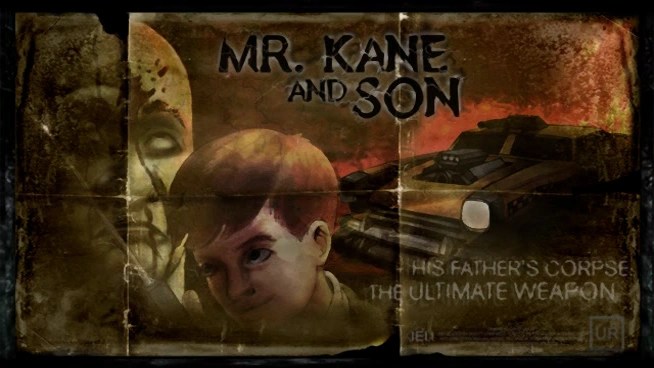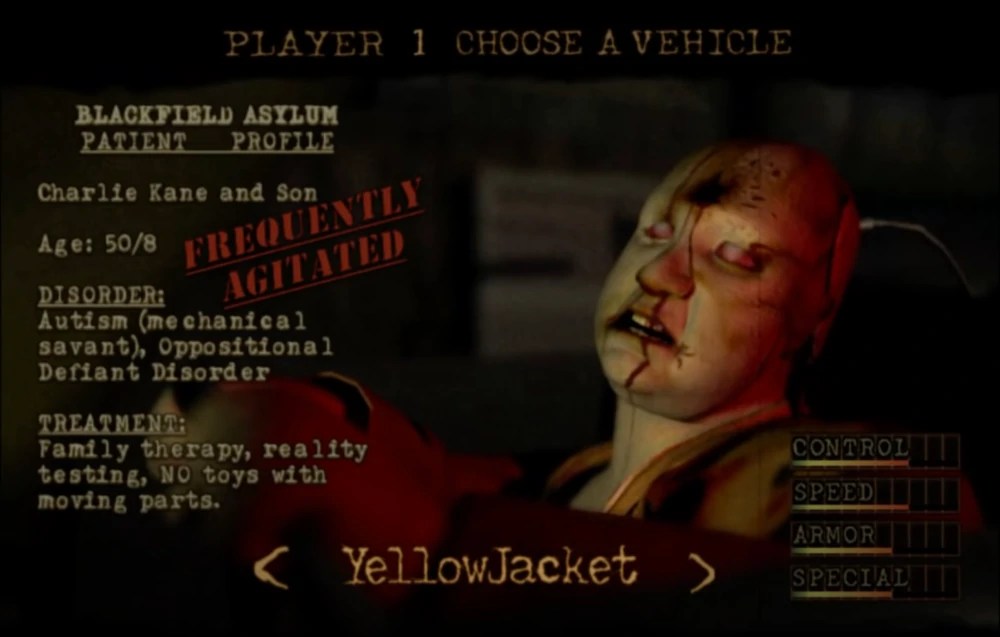 Revenons un peu en arrière. Présent depuis le premier Twisted Metal, Charlie Kane, un chauffeur de taxi, a pour quête de découvrir ce qu’il est arrivé a son fils disparu des années auparavant, qu’on apprends être Needles Kane dans la conclusion de son scénario. Dans Twisted Metal 2, il est le boss final venu « venger » son fils, qu’on a dû tuer durant le mode histoire (ce qui apporte une petite incohérence si on joue avec le clown, mais bon, c’est un personnage bonus obtenable uniquement via un code, je rappelle), et il conduit une version augmentée de Sweeth Tooth nommée Dark Tooth. Dans Black, il revient, avec un twist : le pilote du taxi n’est pas Charlie Kane, mais son corps contrôlé via une télécommande par son fils. Mais qui est le fils, Marcus ou Needles? Plusieurs théories sont possibles, mais celle que je considère la plus juste est que le fils est un faux Marcus Kane, crée par l’esprit de Needles pour cacher dans son subconscient la présence de sa seconde personnalité en tant que Minion (renforcé par le fait qu’il est décrit comme le « bon » fils dans sa biographie). Dans sa cinématique de fin, Calypso tue pour de bon Charlie en détruisant la télécommande, ce qui peut être vu comme une représentation évidente de « tuer le père », et/ou un traumatisme refoulé de Needles.
