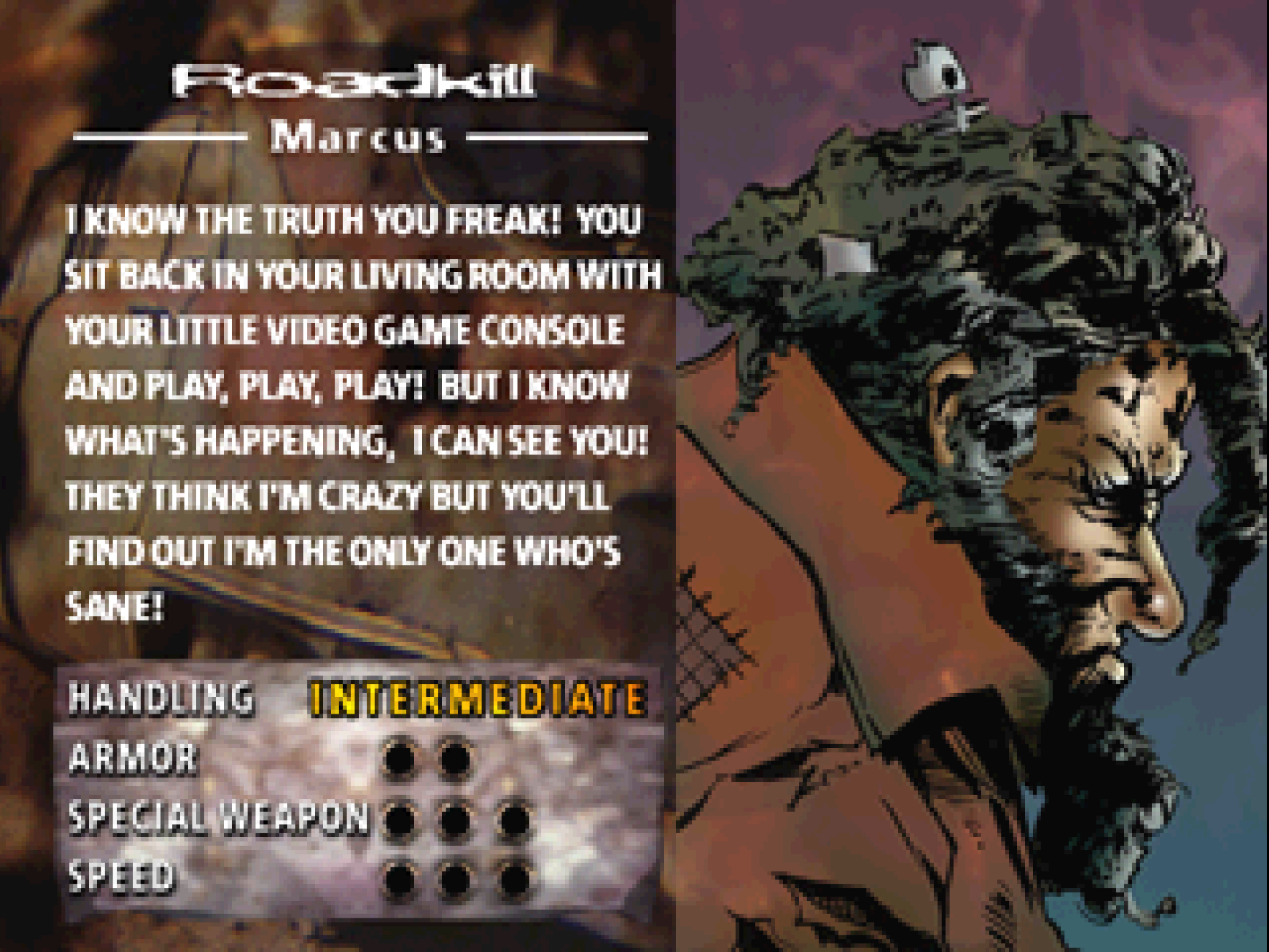 Même Calypso devient un personnage a part entière, là ou dans le premier jeu il n’était que vaguement décrit dans des pavés de textes (mais existait déjà dans des scènes FMV du plus bel effet qui ont été finalement retirées du produit final). Dans Twisted Metal 2 il narre l’expérience complète d’un ton moqueur, comme un maitre de cérémonie burlesque, déclamant « And i thank you for playing Twisted Metal !« , d’un grand sourire, après chaque cinématique de fin. Il semble être conscient qu’un spectateur observe les événements, et prends tout ceci comme une énorme farce.