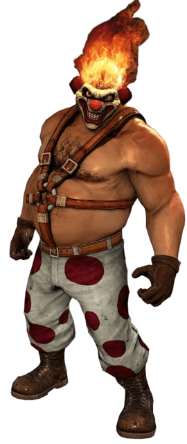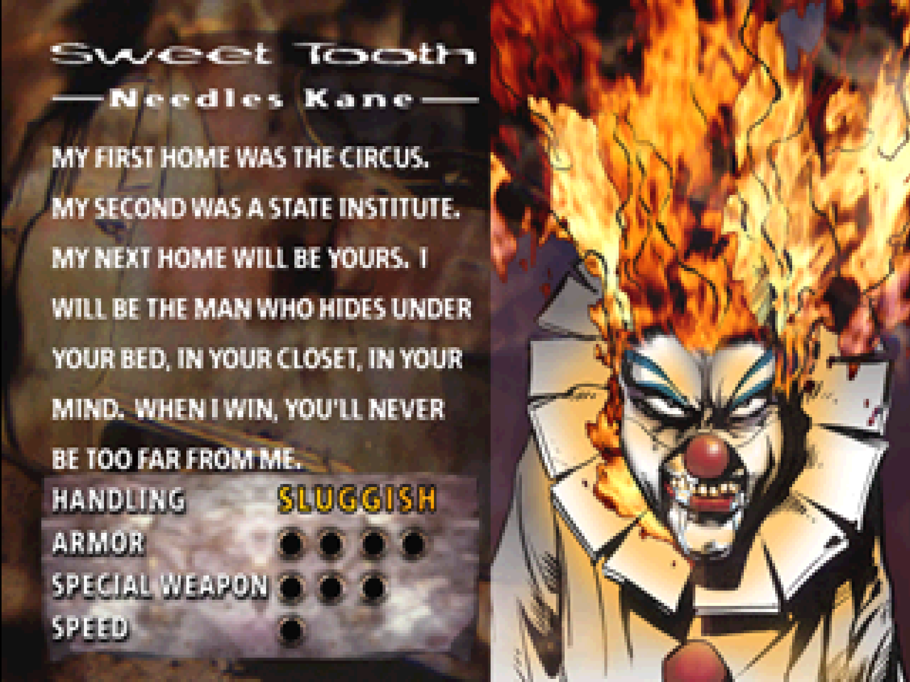 Sweet Tooth quant à lui est bien présent en tant que sous boss, et est jouable uniquement via un code (Haut, L1, Triangle, Droite a l’écran de sélection du véhicule, de rien). Sa biographie, comme celle de Marcus Kane, semble cibler le joueur directement : « Ma première maison fut le cirque. Ma seconde maison fut un orphelinat. Ma prochaine maison sera la tienne. Je serait l’homme qui se cache sous ton lit, dans ton placard, dans ton esprit. Quand je gagnerait, tu ne sera jamais assez loin de moi. » On peut aussi déduire qu’il parle a Marcus Kane en le menaçant de voler son esprit (pour des raisons expliquées plus bas). Mis à part sa présentation, il n’y a pas de choses notables sur lui dans cet épisode.