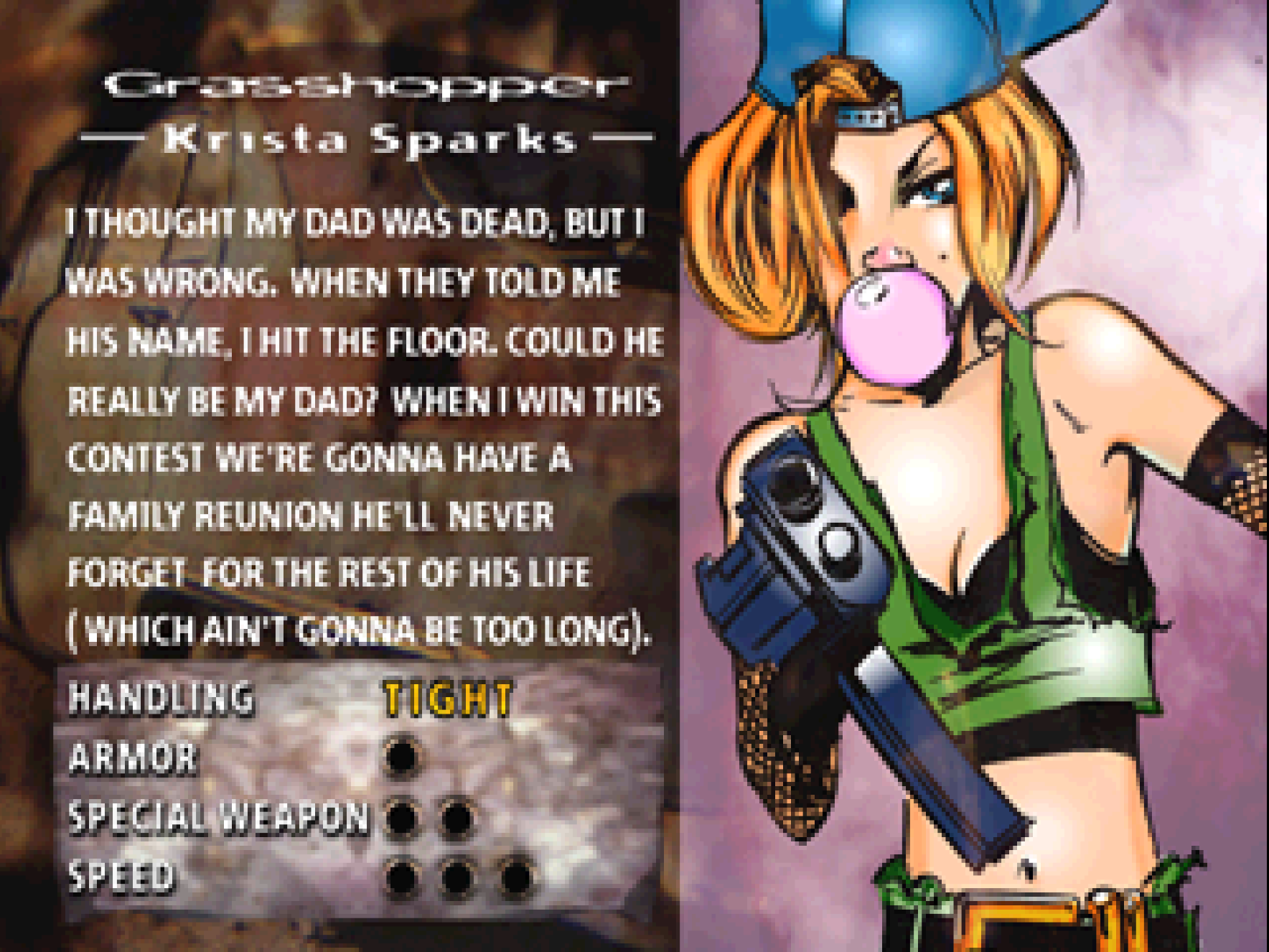 Le premier épisode de Twisted Metal, bien qu’excellent pour 1995, n’était qu’une ébauche pour sa suite qui a défini la vraie identité de la série, apportant un esprit très « comic book » et un humour caustique désamorçant complétement l’extrême violence du titre. Seulement quelques personnages reviennent, dont le clown tueur en série Needles Kane, conduisant son fameux camion de glaces Sweet Tooth, devenu depuis la mascotte de la licence (je précise que Sweet Tooth est le nom du véhicule et non du pilote pour éviter les foudres des puristes).