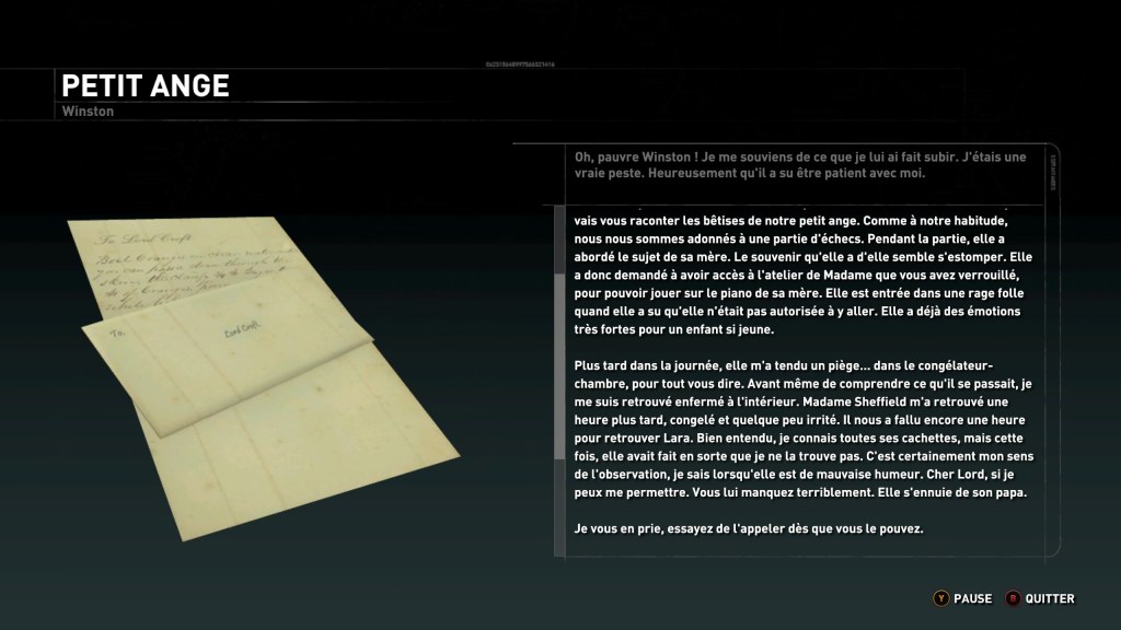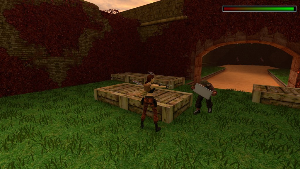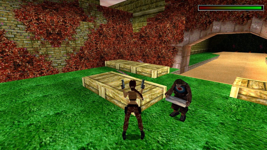 Dès sa première aventure, Lara prends les devants et est au centre de l’attention. Ici, elle narre elle même son tutoriel en faisant visiter sa maison. Ses mouvements sont expliqués de sa voix, via une interprétation culte de Françoise Cadol (qui est pour moi meilleure que la VO). Lara parle ici explicitement des touches de la manette (« faites flèche avant pour avancer », « faite carré pour sauter », etc) : c’est elle qui donne le droit au joueur de prendre le contrôle, pas autre chose. Ce niveau restera un des moments les plus marquants du titre, et sera souvent repris dans les suites (tel quel dans 2 et 3, puis remanié dans les épisodes plus récents).