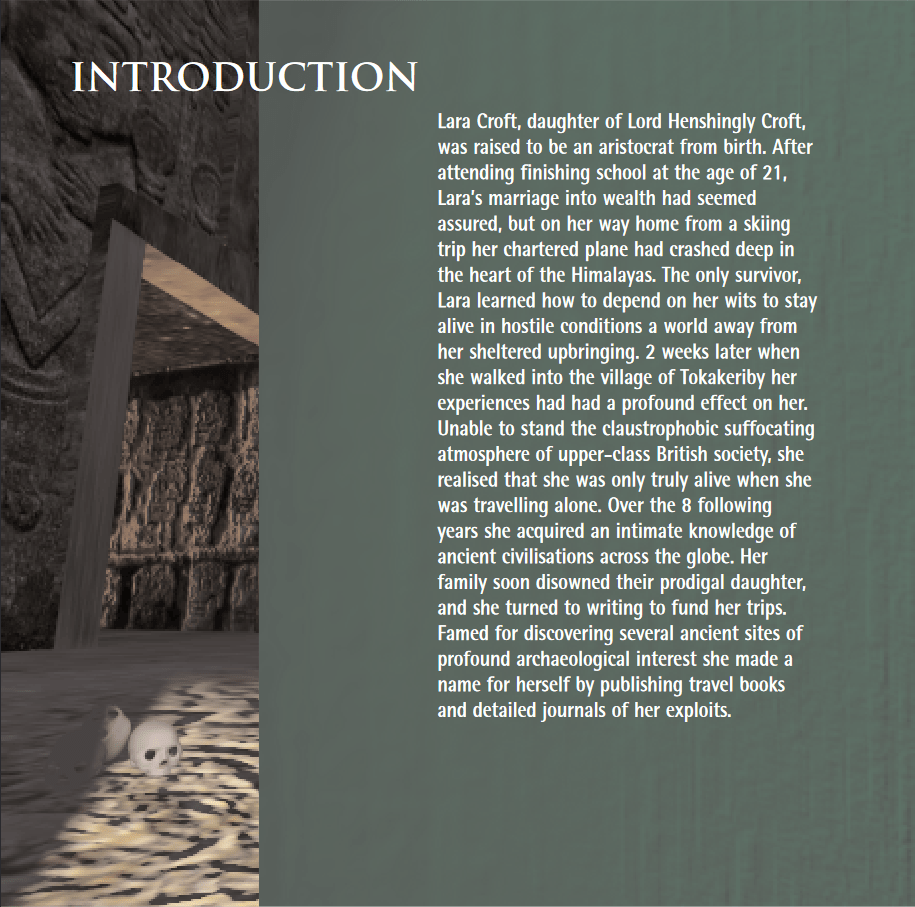 Lara Croft, fille du Lord Henshingly Croft, a grandi dans un milieu aristocratique. A la fin de ses études, à l’âge de 21 ans, le mariage de Lara dans la bourgeoisie semblait une évidence, mais sur le chemin du retour d’un séjour au ski son avion s’écrase au fin fond des montagnes himalayennes. Seule rescapée, Lara dû apprendre à utiliser toutes les ressources nécessaires pour survivre par sa propre volonté dans des conditions hostiles, à des années lumière de son cocon doré. Deux semaines plus tard, quand elle trouve le village de Tokakeriby, cette expérience l’à transformée. Ne supportant plus le monde étriqué et coincé de la haute société britannique, elle découvre qu’elle est faite pour parcourir le monde en solitaire. Durant les huit années suivantes, elle se consacre à l’étude des civilisations anciennes du monde entier, mais ses parents ne tarderont pas à déshériter leur fille prodige. Elle se met alors à écrire les récits de ses voyages pour financer les suivants. Célébrée pour avoir découvert plusieurs sites anciens à l’intérêt archéologique indéniable, elle deviendra célèbre pour les récits de ses exploits.