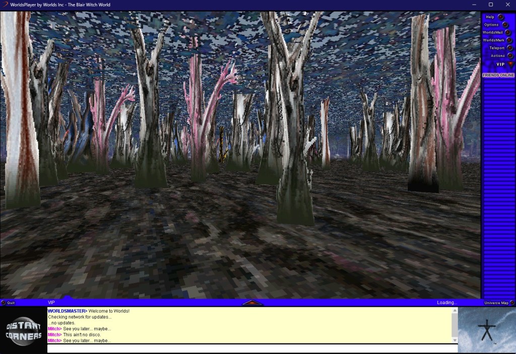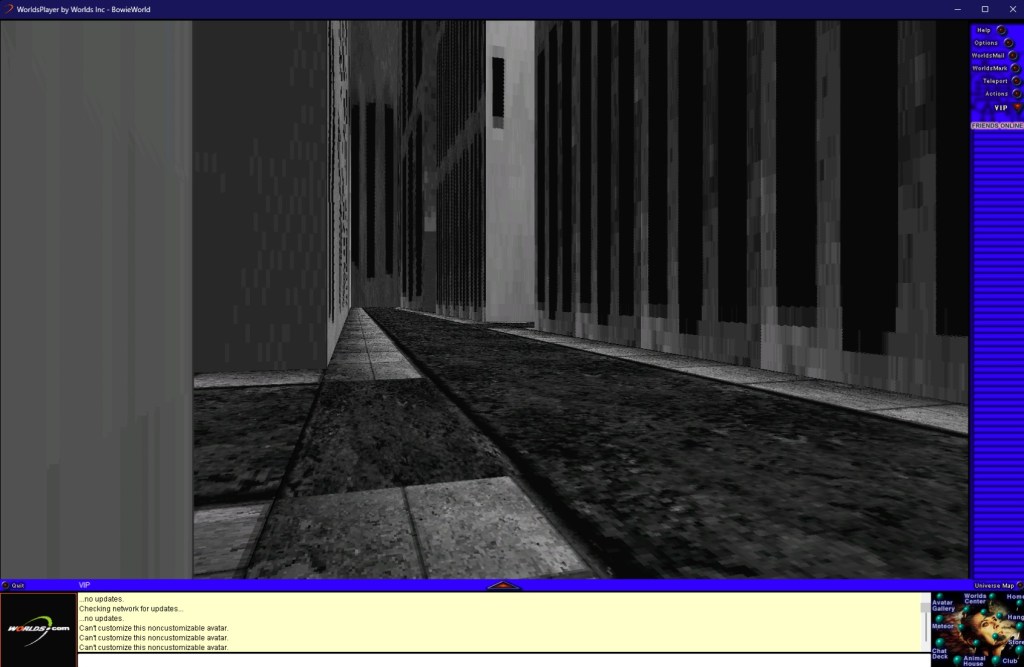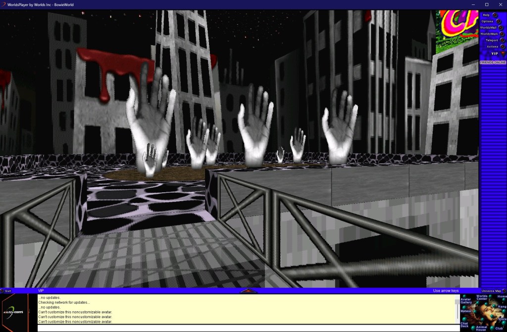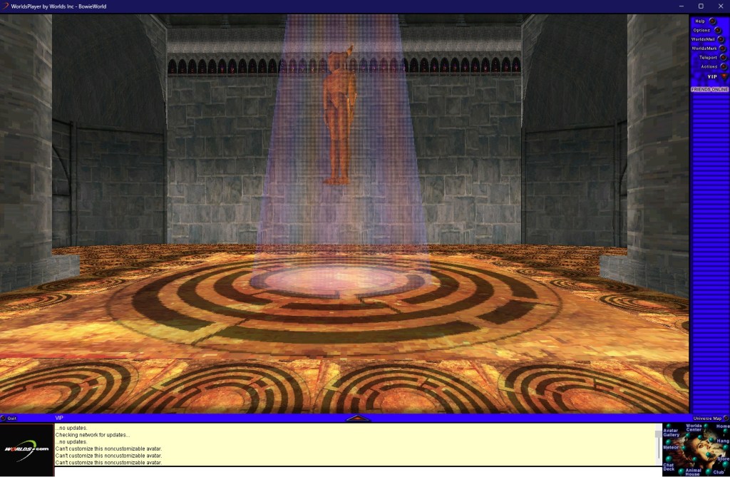 Devenu l’un des derniers vestiges de l’internet d’avant, Worlds.com est une curiosité fréquemment visitée par des intrépides explorateurs virtuels. Peut-être parce qu’il est le lieu le plus abouti visuellement du jeu, l’espace dédié à David Bowie en est depuis devenu la porte d’entrée et son existence s’est propagée sous le manteau parmi les communautés online avides de curiosités. A la mort de l’artiste en 2016, des fans se sont retrouvés dans les lieux pour partager leurs souvenirs entre initiés (j’ai d’ailleurs récupéré les trois gifs postés plus haut de l’article mis en lien). Jusqu’en 2020, le site était disponible tel quel, dans son jus de l’an 2000, et il fallait télécharger le programme puis chaque monde manuellement via des temps de chargement interminables. Depuis, le logiciel a été mis à jour et son accès facilité ; pour surfer sur la vague du Metaverse, les créateurs ont donné un petit coup de plumeau sur le programme et l’ont carrément renommé « Bowie World », faisant démarrer les joueurs dans l’espace dédié au chanteur.