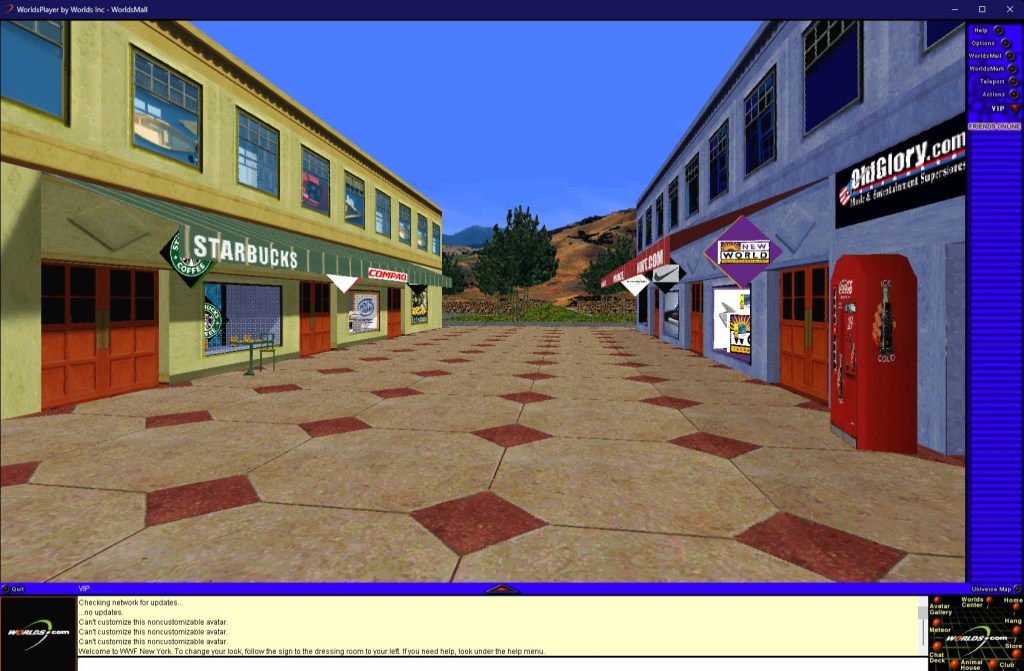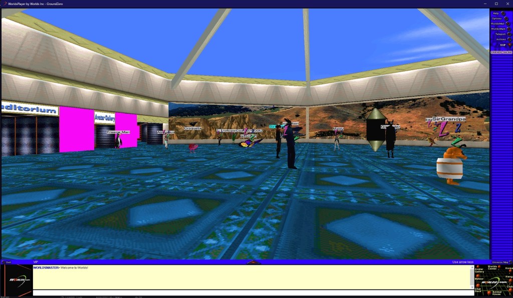 Développé dès 1994 par l’entreprise Worlds.net, Worlds Chat est un monde virtuel où plusieurs salles sur des thèmes dédiés peuvent être explorée via un avatar permettant d’interagir avec d’autres joueurs et discuter avec eux. Le concept peut maintenant être vu comme simpliste, mais était particulièrement bien conçu, notamment dans son aspect visuel très poussé : la vue est une sorte d’hybride entre FPS et troisième personne où l’on voit son personnage de dos dans des environnements en 3D texturés selon le thème du lieu. D’abord pensé comme interface d’un monde virtuel destiné aux enfants malades pilotée par Steven Spielberg, cet aspect du projet est abandonné à cause des limitations de la technologie de l’époque et se recentre plutôt sur l’aspect communautaire, avec une pointe d’interactivité. Après une phase beta terminée en 1996 par la destruction du monde, Worlds Chat rentre dans sa phase commerciale.
