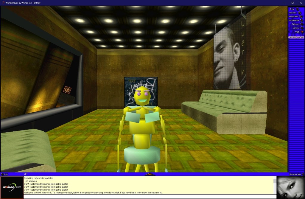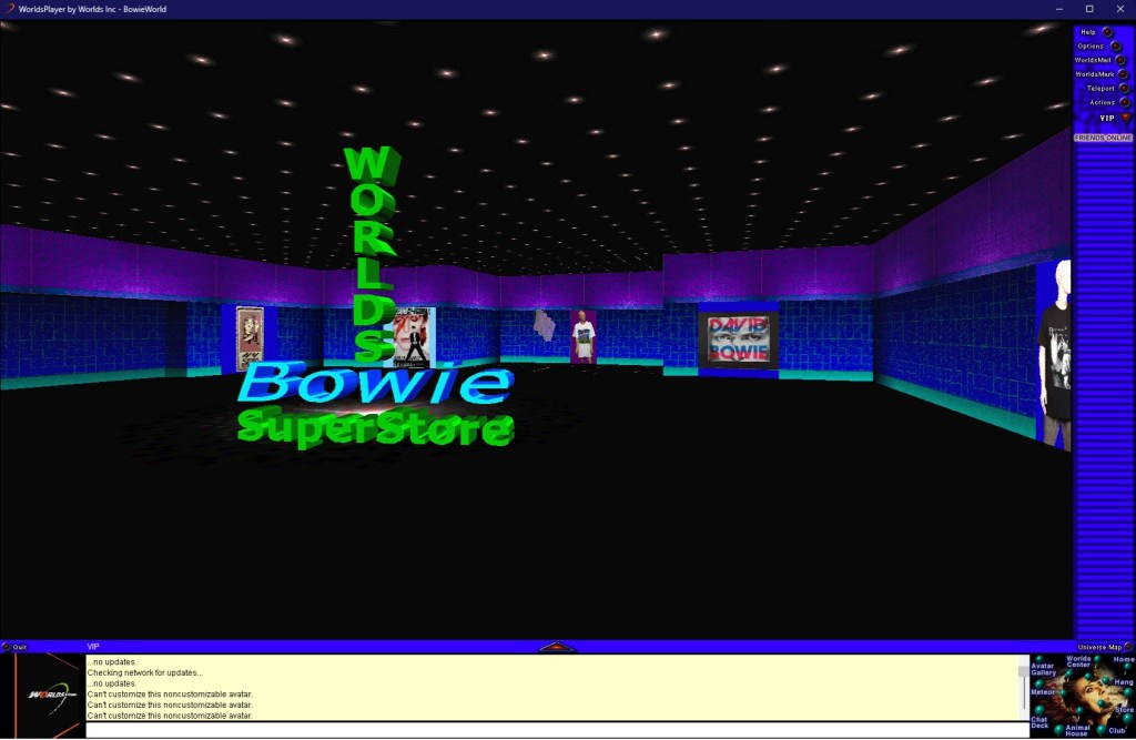 Durant ces années de rodage, Worlds Chat héberge AlphaWorlds où aura lieu le premier mariage dans un monde virtuel et des soirées à thèmes. En 1998, le logiciel change de moteur graphique et s’ouvre à la création de mondes sponsorisés, devenant Worlds.com au passage (Alphaworlds devenant de son côté sa propre entité). Des concours étaient organisés, ainsi que des soirées trivia, des soirées poésie… Parfois avec l’aide d’invités venus pour l’occasion. Parmi les mondes sponsorisés, on pouvait trouver un monde sur le thème Aerosmith, un monde basé sur Britney Spears, un centre commercial proposant diverses marques réelles, un autre sur les NY Yankees, la WWE (quand ils s’appelaient encore WWF) et bien sûr notre sujet du jour, David Bowie. Il est également possible d’y créer ses propres niveaux, plus ou moins cachés, ce qui fait exploser le potentiel de l’expérience. En 2001, le jeu avait 1 millions d’inscrits (plutôt pas mal, étant donné qu’il y avait moins de 100 millions d’abonnés à internet aux USA en 2000).