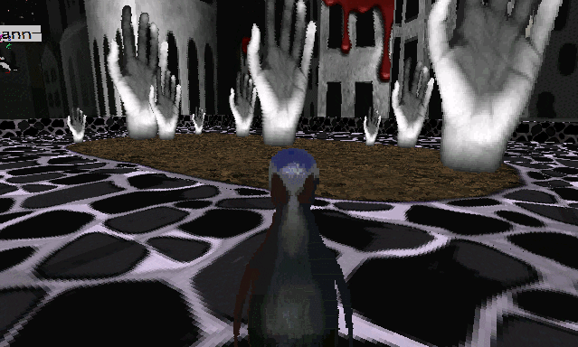 Après une brève visite de la galerie pour choisir son avatar, la première salle est un regroupement de mains entourées par des bâtiment en sang. Je ne sais pas ce que représentent les mains, mais les bâtiments font référence aux décors de la tournée pour l’album Diamond Dogs. En cliquant sur celles-ci, des messages apparaissent :
