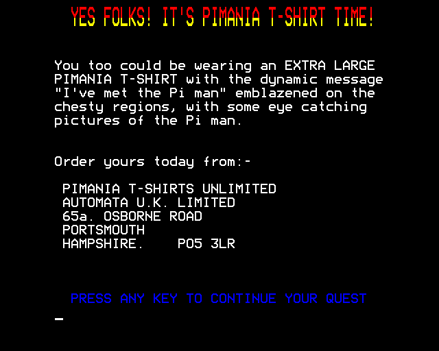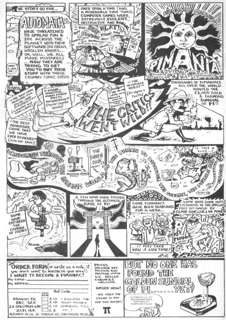 Le plus grand succès commercial d’Automata UK, PiMania en 1982, met en scène un personnage de cartoon grotesque, PiMan (dont le nom vient de la touche « Pi » du ZX Spectrum), dans une aventure textuelle où il faudra trouver des trésors dans un lieu fantasmagorique. Sept de ces récompenses serviront dans la résolution de la quête finale, quand les autres devront être données au PiMan pour obtenir son assistance en le faisant changer d’humeur (par exemple, la tourte a la viande empêche le PiMan affamé de voler notre nourriture, ou du valium permet de calmer le PiMan apeuré). L’humour n’est pas sans rappeler le futur Monkey Island, notamment quand PiMania demande d’appuyer sur la touche « key » du clavier pour ouvrir une porte comme toute première énigme.