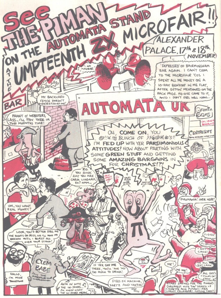 Fort du succès de son aventure très singulière dans le paysage vidéoludique de l’époque, PiMan devient la mascotte de la boite, et sera mis en scène dans plusieurs comic strip, des albums de musique, et pas mal de merch ; Christian Penfold, bras droit de Mel Croucher, se déguisera même comme le personnage dans divers événements publics. Des publicités sous forme de mini BD font apparition dans les magazines, et étendent l’univers du personnage. Automata UK, via le Piman, devient un éditeur culte dans ces premières années de l’histoire du jeu sur ordinateurs.