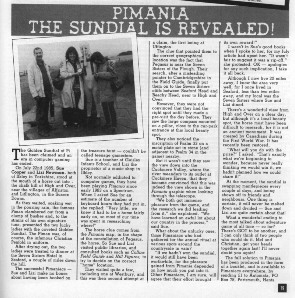 En grand précurseurs des ARG, les joyeux lurons de Automata UK intègrent une chasse au trésor dans PiMania, inspirée du livre Mascarade sorti en 1979. Un « Golden Sundial of Pi » (le cadran solaire d’or de Pi) d’une valeur de £6000 était offert a ceux ayant décodé les indices disséminés dans le jeu et qui pouvaient être utilisés en parallèle pour trouver les éléments dans le monde réel. Le prix fut remporté trois ans plus tard (grâce à une belle piste sur les chevaux), mais aucune preuve de l’existence de l’objet n’existe mis à part une unique photo d’époque. Par la suite, d’autres concours permetront de gagner des prix plus conventionnels, comme un voyage a New York ; ces concours, en plus de permettre de faire de la pub a peu de frais, assurent un nombre de ventes conséquentes par ceux tentant de remporter les prix.
