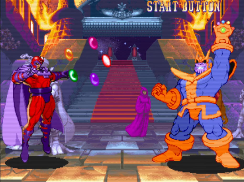 En parallèle, se prépare le petit frère de X-Men : Children of the Atom, un jeu cette fois ci basé sur l’univers Marvel en général, par une équipe annexe. La Saga de l’Infini, maintenant bien connue des amateurs du MCU, est choisie comme intrigue principale du fait de la présence de tous les héros dans son climax. Le jeu s’appellera Marvel Super Heroes, et sortira en 1995.