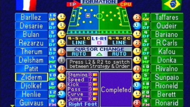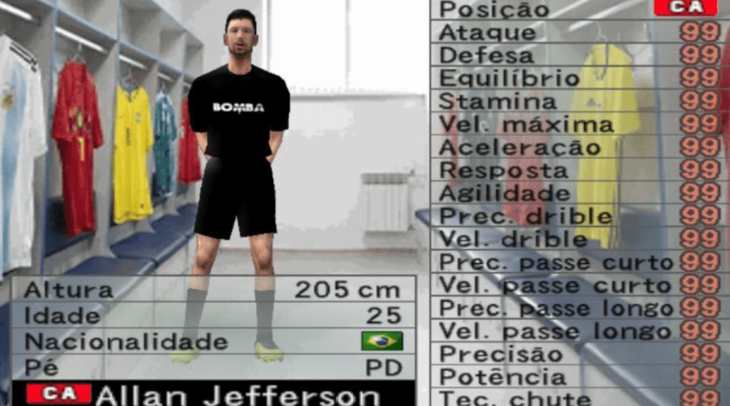 Je ne vais pas m’étaler sur une leçon de foot, donc passons quelques années où le sport reste tout aussi populaire dans le pays pour arriver directement dans les années 90 : Superstar Soccer, Sensible Soccer, EA Soccer ou encore Kick Off ! se partagent le gâteau footballistique vidéoludique. Forcément, finances obligent (et le jeu officiel FIFA qui fera son apparition en 1993), les jeux n’ont pas les licences officielles des joueurs, ce qui les forcent à inventer des noms plus ou moins parodiques ; de toute façon les graphismes de l’époque font que tous les modèles de joueurs sont interchangeables mis à part la couleur des maillots. On se retrouve par exemple avec des Facu (Cafu), Roberto Larcos (Roberto Carlos) ou encore Ronaird (Ronaldo).