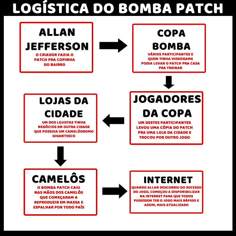 D’abord en éditant manuellement via les menus du jeu les noms des joueurs, il distribue une sauvegarde spéciale avec tous les noms officiels des joueurs brésiliens qu’il utilisera pour les tournois, se propageant dans tout son groupe d’amis. Ce succès le motivera à créer une vraie version du jeu avec les noms intégrés en apprenant les outils de moddeur via des forums et des communautés internet (il aurait d’ailleurs travaillé dans les années 90 sur une traduction de International Superstar Soccer), et le distribuera sous le manteau via des versions pirates physiques moddée de PES 6. Ne se contentant pas de créer les noms, il remplacera carrément certaines équipes par des équipes locales absentes de la simulation de foot, comme São Paulo ou les Conrinthian. Le Bomba Patch était né, prenant le nom du tournoi qui l’avait inspiré, et sera mis à disposition dans son magasin. Il profitera de son expérience pour également produire des mods de GTA San Andreas, un autre chouchou de la scène modding.